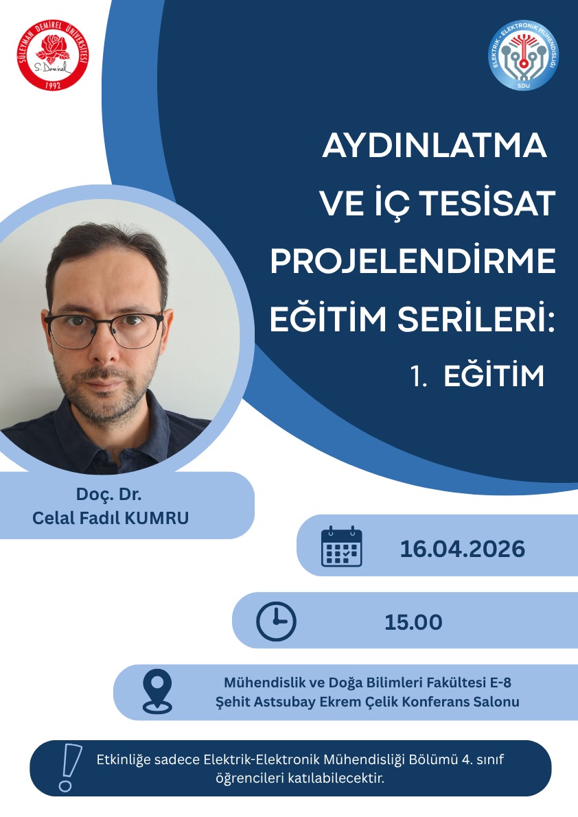 Doç. Dr. Celal Fadıl Kumru tarafından verilecek olan “Aydınlatma ve İç Tesisat Projelendirme” eğitim serisinin ilki, 16 Nisan 2026 Perşembe günü saat 15:00’te gerçekleştirilecektir.