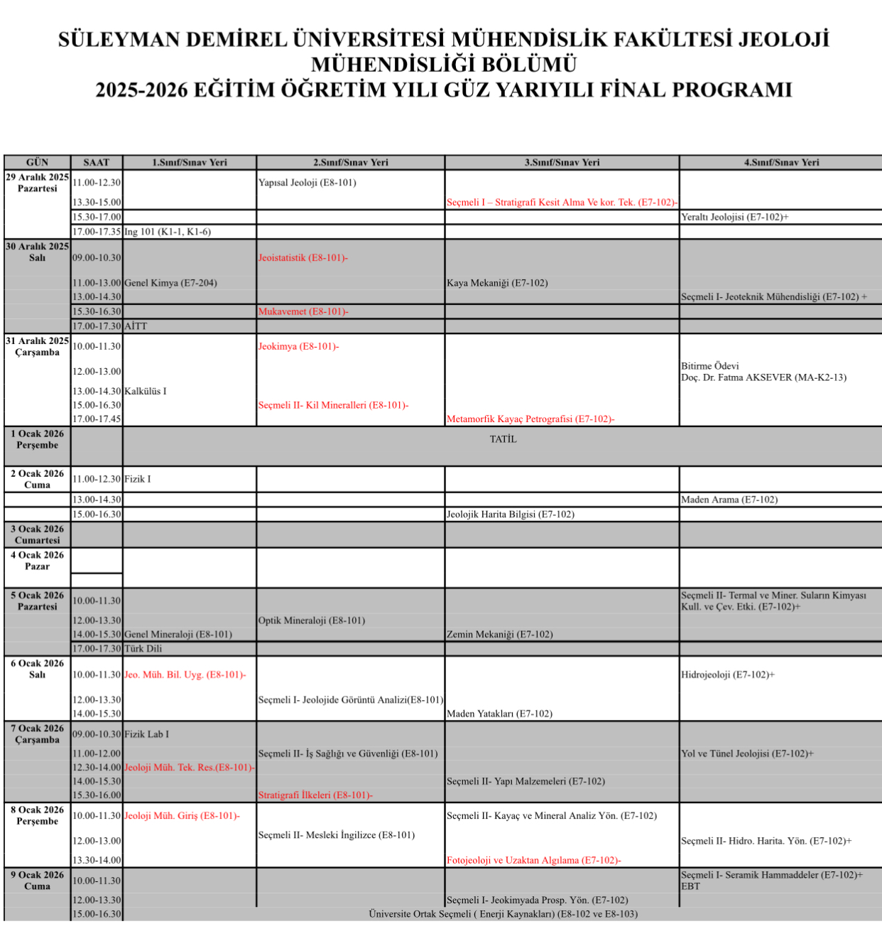 2025-2026 Güz Dönemi Final Programı