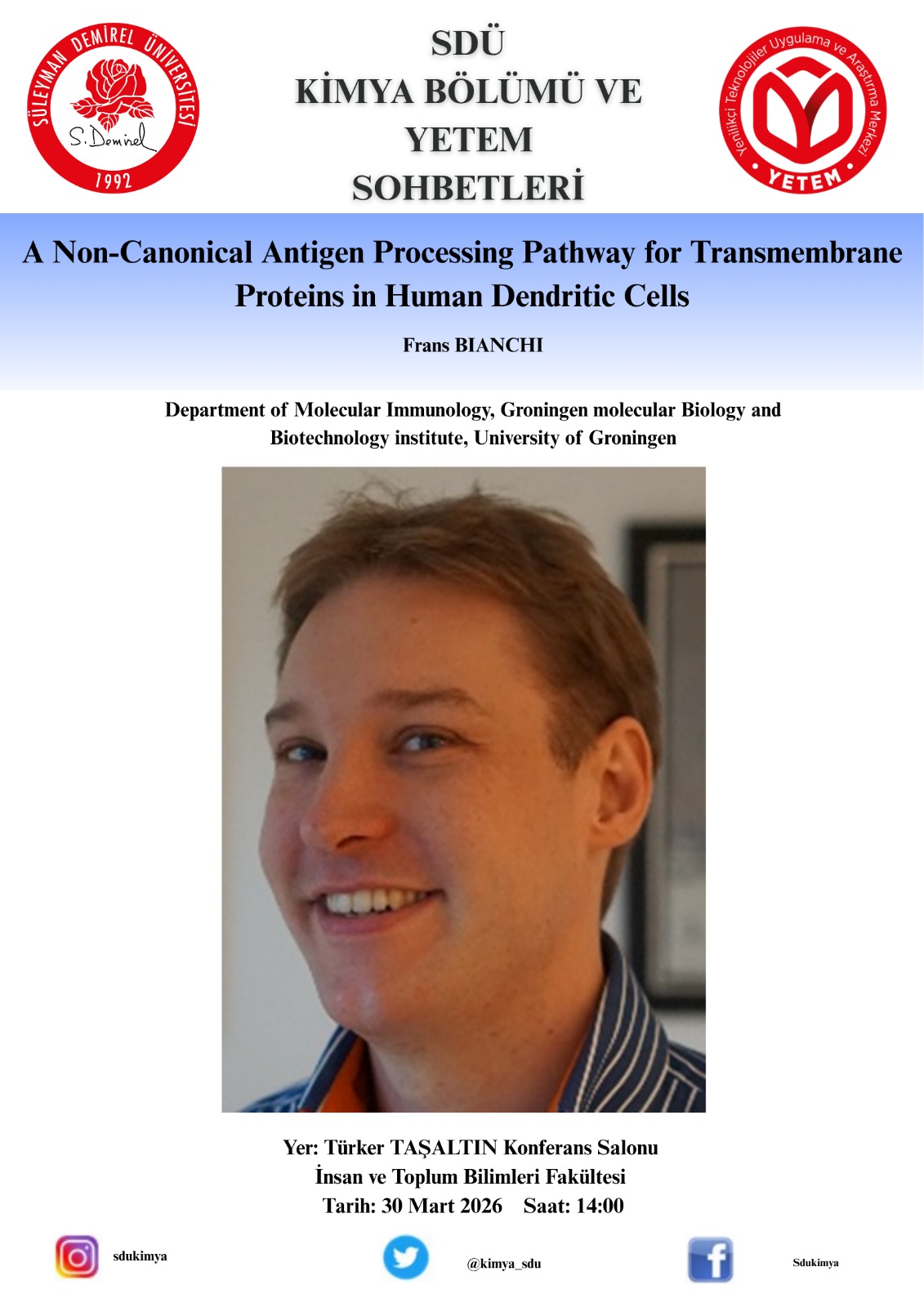 SDÜ Kimya Bölümü ve YETEM Sohbetleri: Frans Bianchi Semineri 30 Mart 2026 14.00 Yayın Tarihi: 27/03/2026 Okunma Sayısı: 14