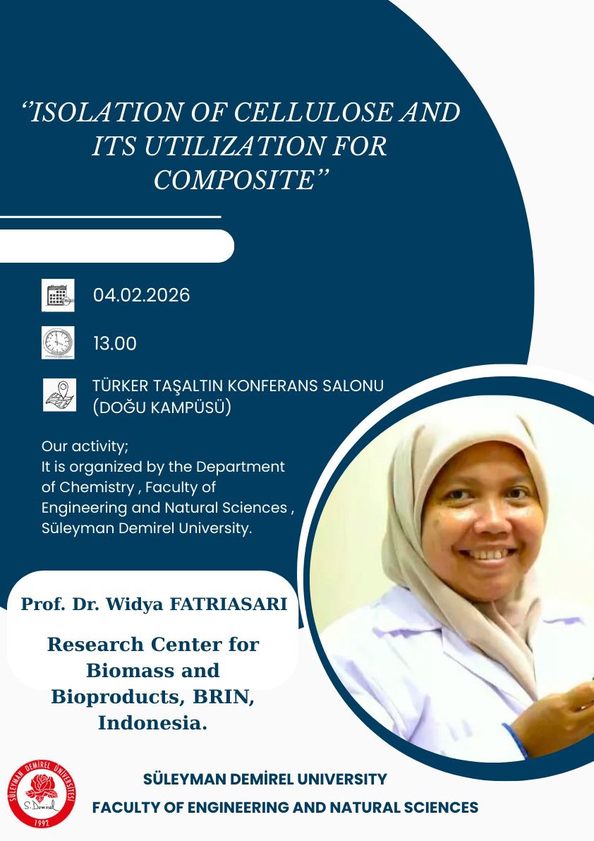 Seminer: Prof. Dr. Widya Fatriasari ''ISOLATION OF CELLULOSE AND ITS UTILIZATION FOR COMPOSITE'' Researcher Center for Biomass and Bioproducts, BRIN, Indonesia, 4 Şubat 2026 13:00 Yayın Tarihi: 22/01/2026 Okunma Sayısı: 23