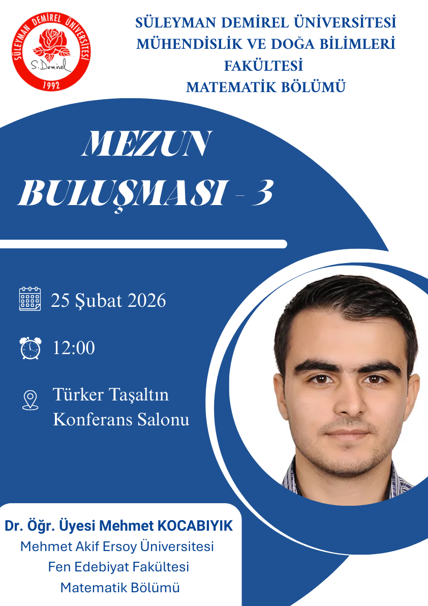 Mezunumuz Dr. Öğr. Üyesi Mehmet KOCABIYIK ile gerçekleştireceğimiz "Mezun Buluşması-3" etkinliğine tüm Matematik Bölümü öğrencileri davetlidir.