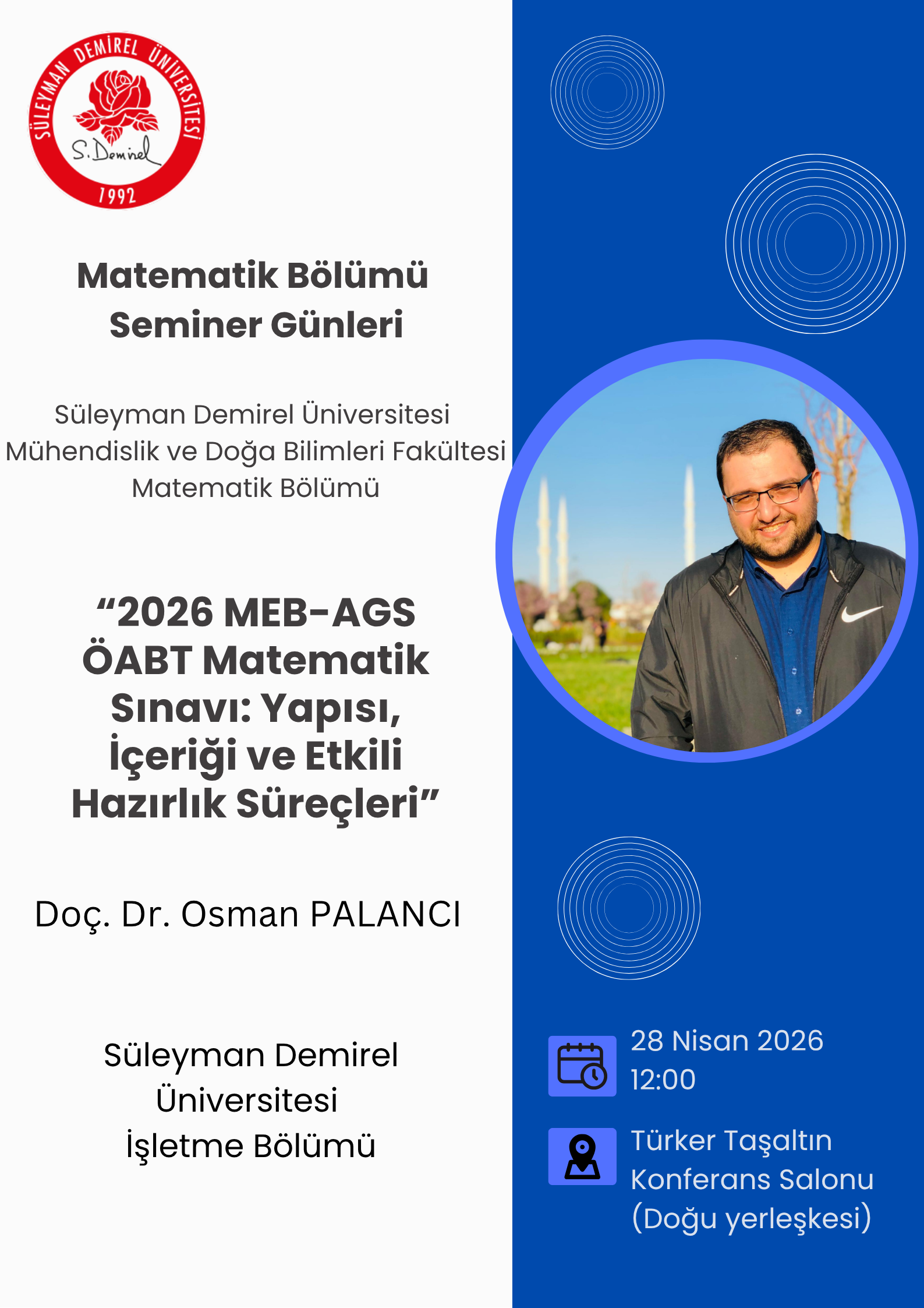 Bölümümüzün düzenlediği, Süleyman Demirel Üniversitesi İşletme Bölümü Öğretim Üyesi Doç. Dr. Osman PALANCI'nın vereceği "2026 MEB-AGS ÖABT Matematik Sınavı: Yapısı, İçeriği ve Etkili Hazırlık Süreçleri" başlıklı seminere tüm akademik personelimiz ve öğrencilerimiz davetlidir.