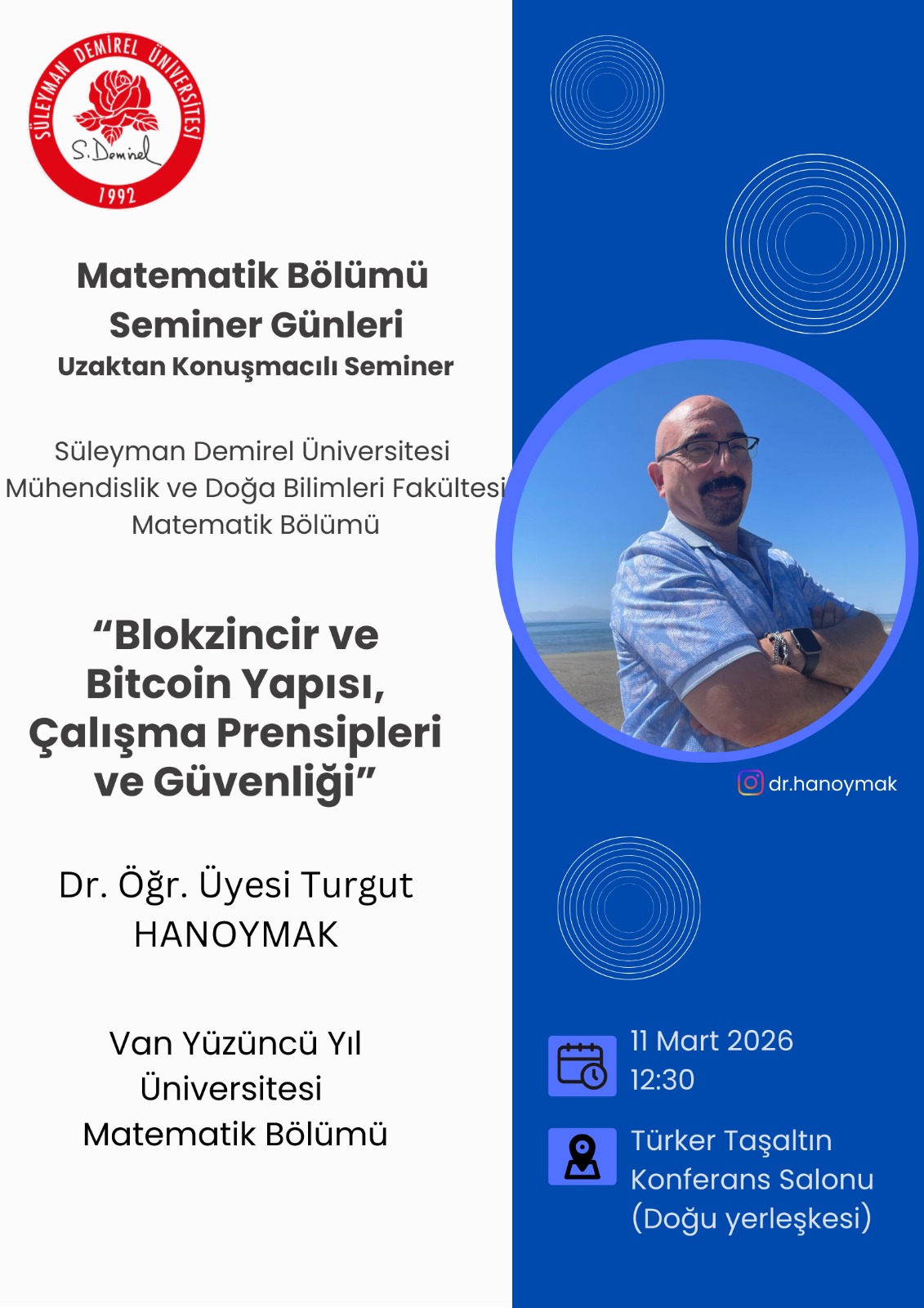 Van Yüzüncü Yıl Üniversitesi Matematik Bölümü öğretim üyesi Dr. Öğr. Üyesi Turgut HANOYMAK’ın uzaktan konuşmacı olarak katılacağı Türker Taşaltın Konferans Salonunda gerçekleştirlecek “Blokzincir ve Bitcoin: Yapısı, Çalışma Prensipleri ve Güvenliği” başlıklı seminerimize tüm öğrencilerimiz ve akademik personelimiz davetlidir.